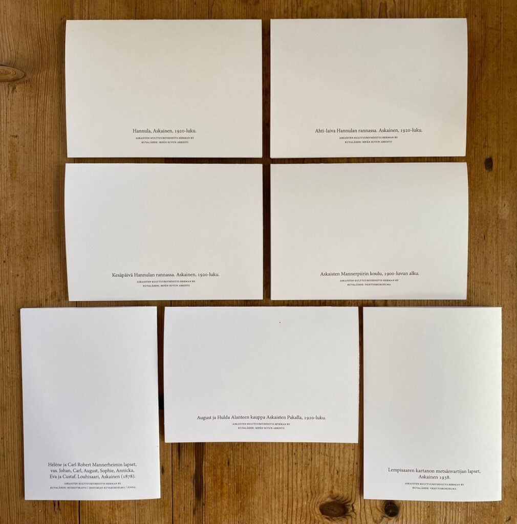 Helpoiten tuette Hermanin toimintaa ostamalla kuvan Askainen-aiheisia postikortteja. Kääntöpuolella on kerrottu kuvan selitys ja ajankohta.