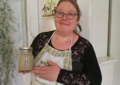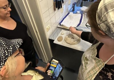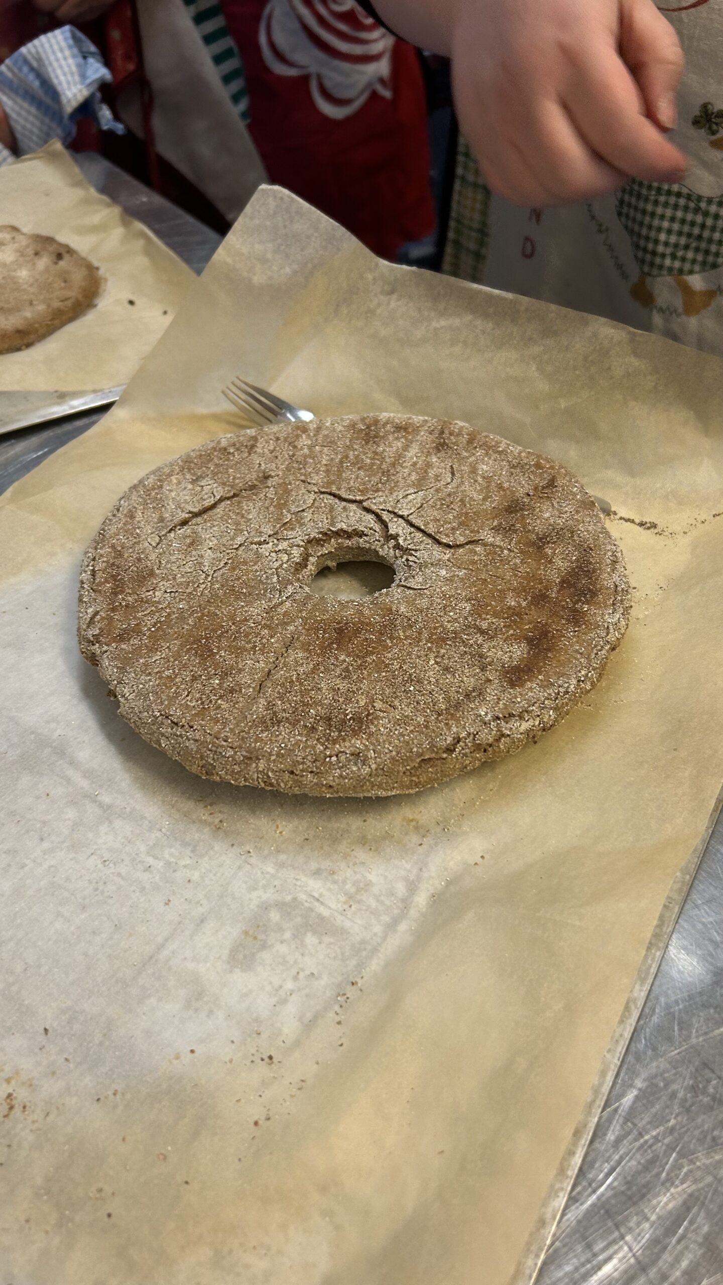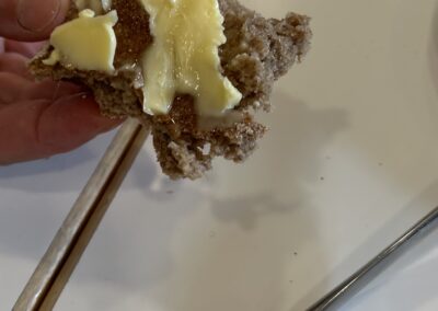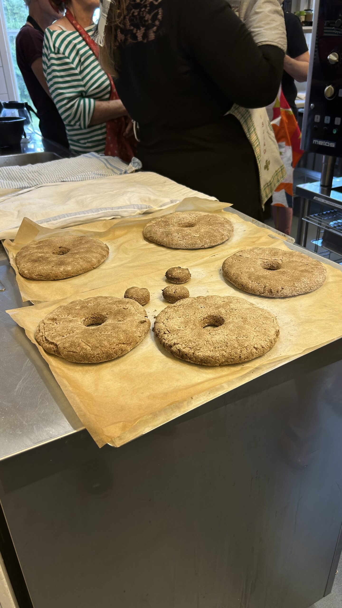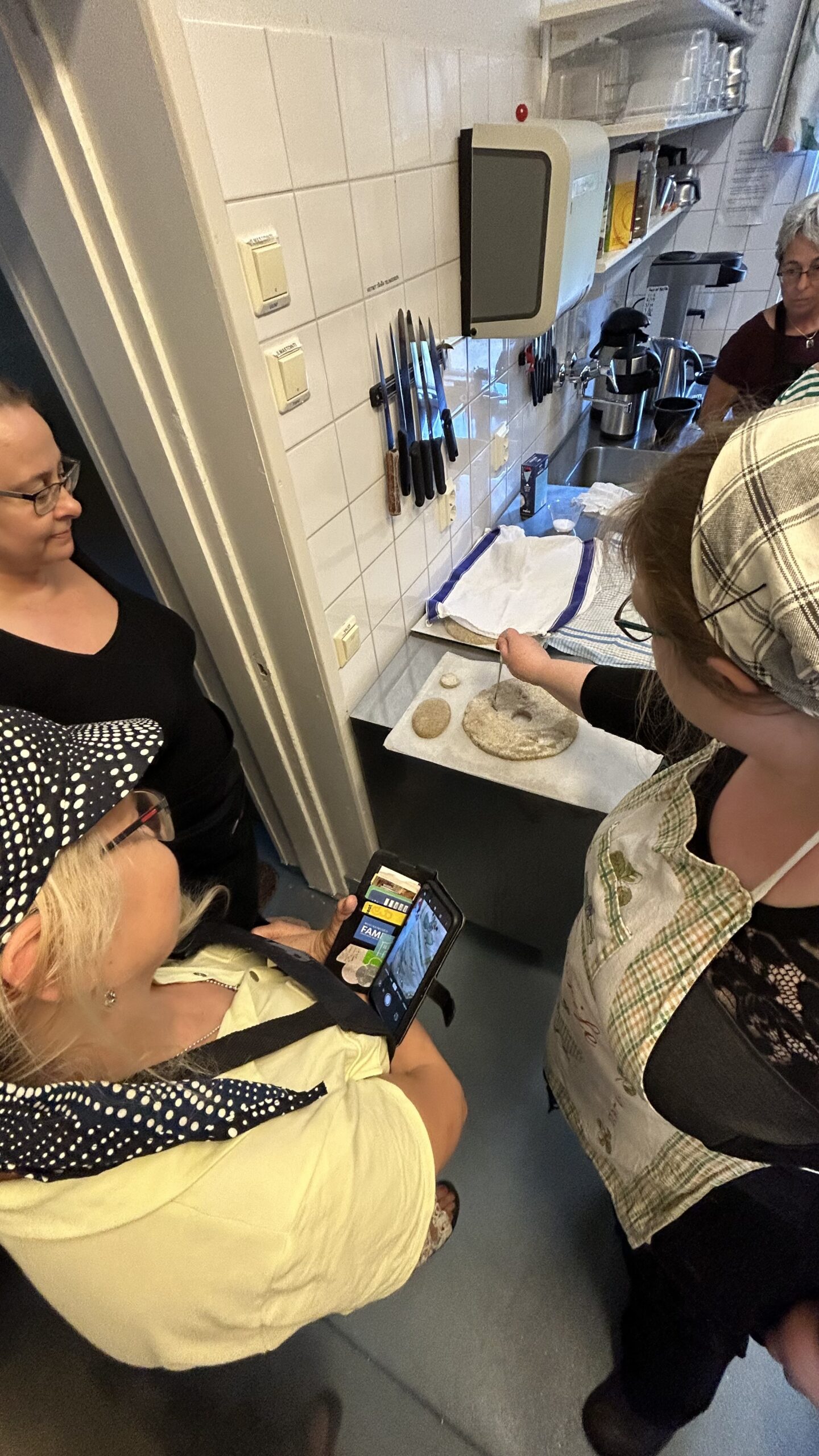 Juurileipätyöpajassa kuultiin erilaisia perinnevinkkejä leivän eri vaiheiden arviointiin. Pohdimme lisäksi ruisjuuren muita käyttötapoja, tutustumme historiaan, ja tietenkin jokainen sai oman juuren halutessaan mukaan reseptin kera. Valmis, lämmin leipä sai ilahtuneita huudahduksia.