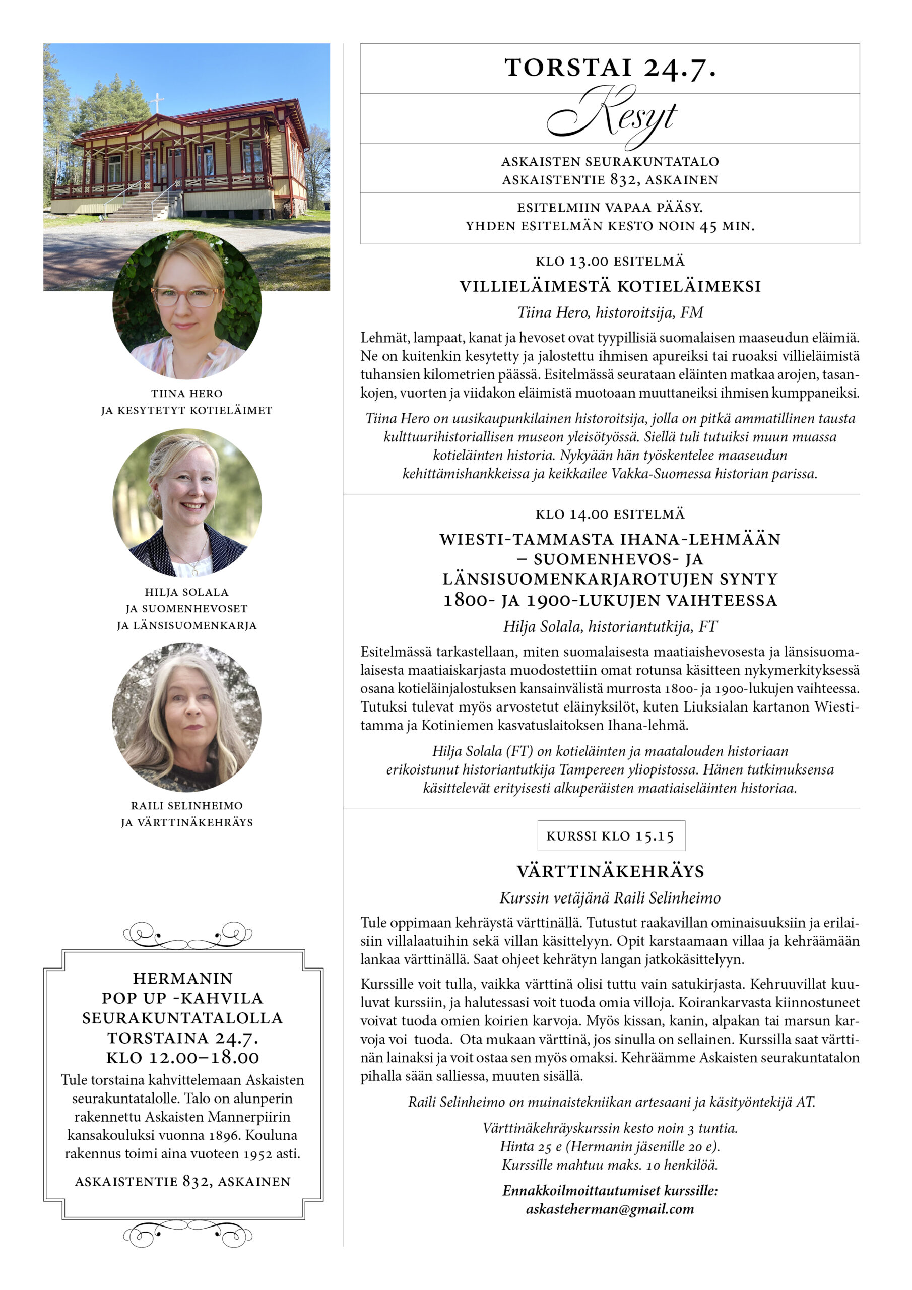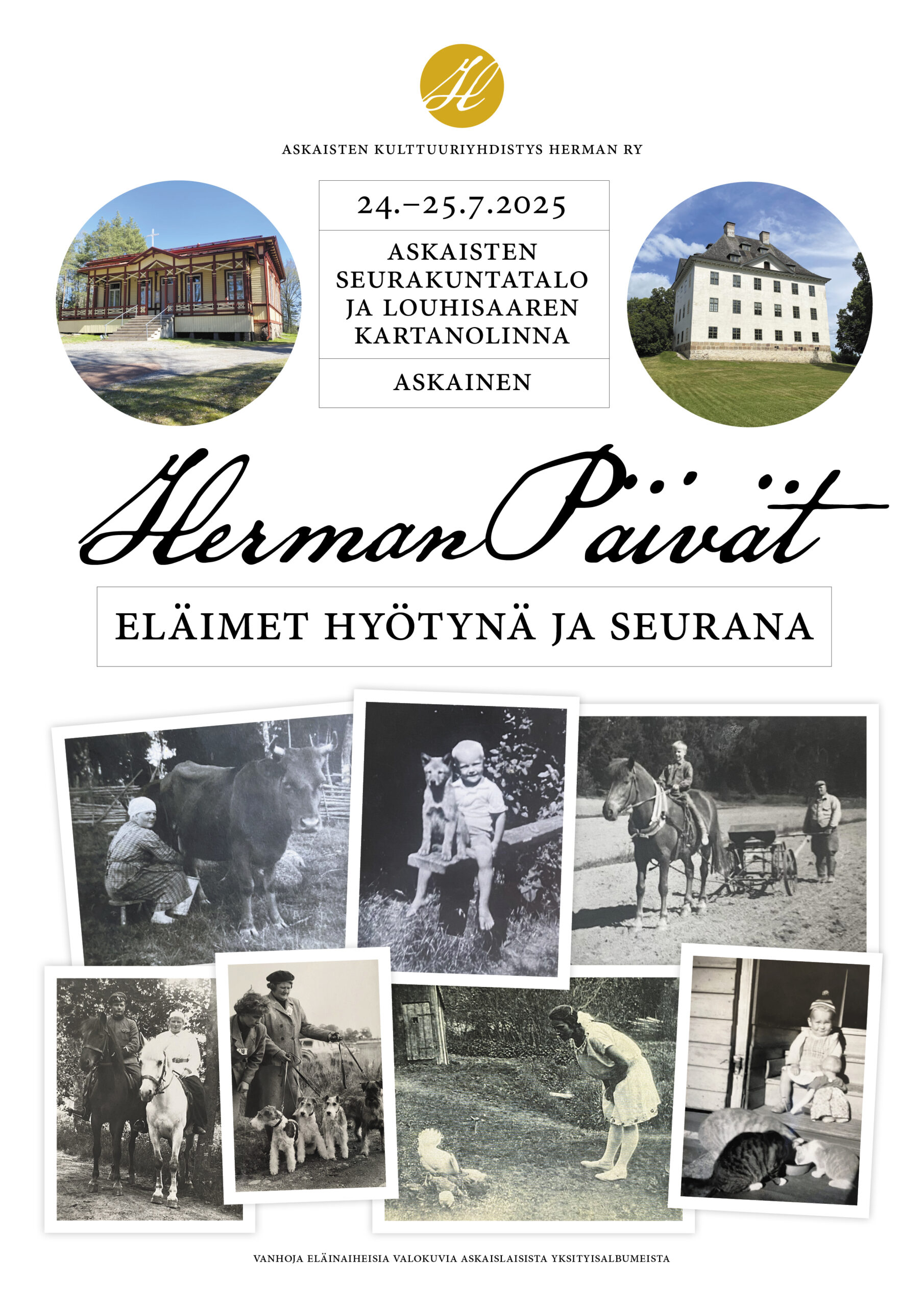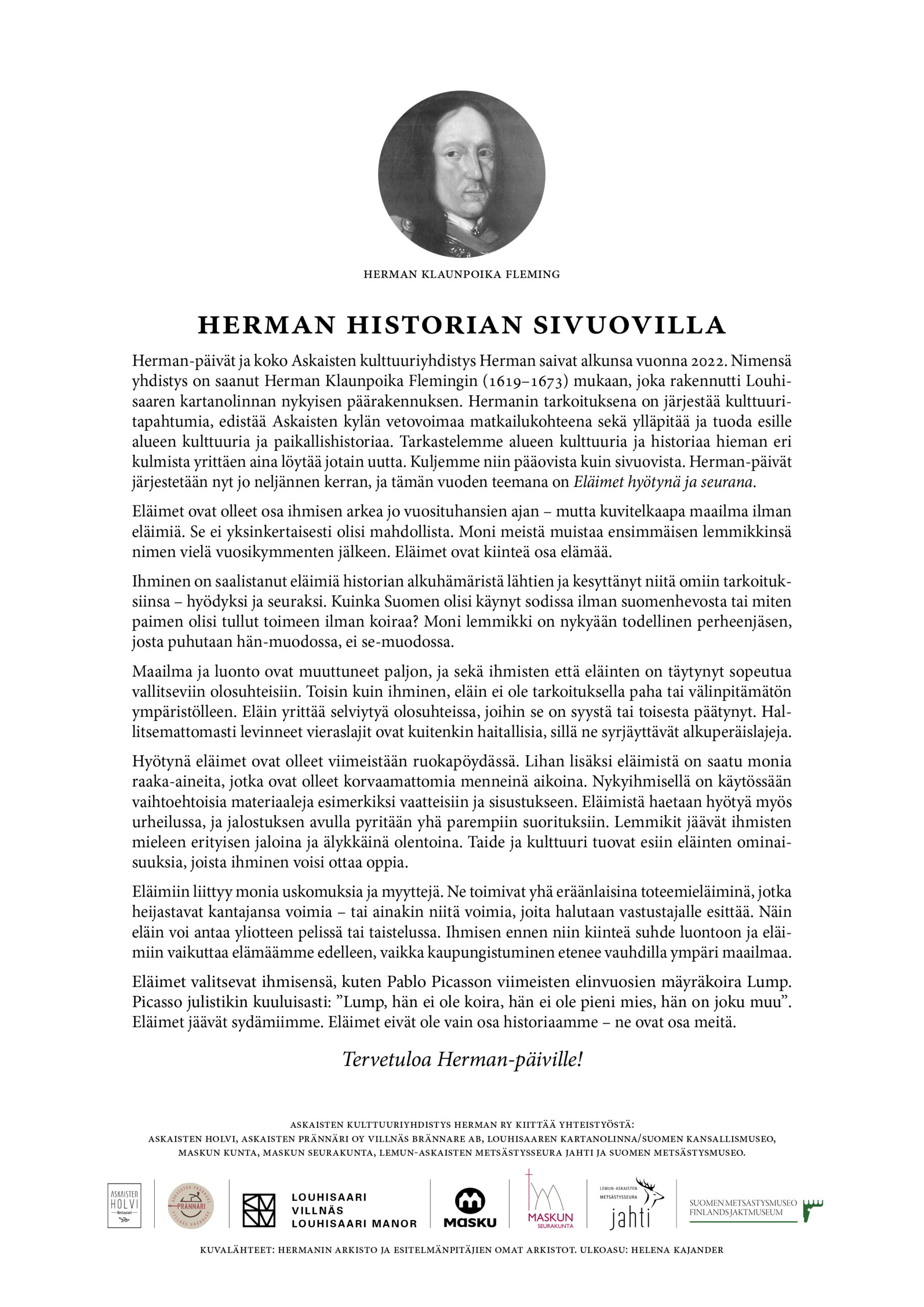 Herman-päivät ja koko Askaisten kulttuuriyhdistys Herman saivat alkunsa vuonna 2022. Nimensä yhdistys on saanut Herman Klaunpoika Flemingin (1619–1673) mukaan, joka rakennutti Louhisaaren kartanolinnan nykyisen päärakennuksen. Hermanin tarkoituksena on järjestää kulttuuritapahtumia, edistää Askaisten kylän vetovoimaa matkailukohteena sekä ylläpitää ja tuoda esille alueen kulttuuria ja paikallishistoriaa. Tarkastelemme alueen kulttuuria ja historiaa hieman eri kulmista yrittäen aina löytää jotain uutta. Kuljemme niin pääovista kuin sivuovista. Herman-päivät järjestetään nyt jo neljännen kerran, ja tämän vuoden teemana on Eläimet hyötynä ja seurana.